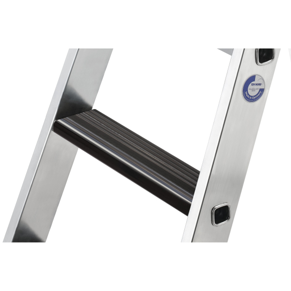 Die stabile Leiter besteht aus robusten Rechteckrohr-Holmen und bietet mit ihren geriffelten Stufen und der großen Plattform einen ausgezeichneten Halt. Die 4-fach gebördelte Stufen-/Holmverbindung sorgt zusätzlich für eine hohe Sicherheit. Dank der konischen Holmführung steht die Leiter stabil und sicher auf dem Boden.
