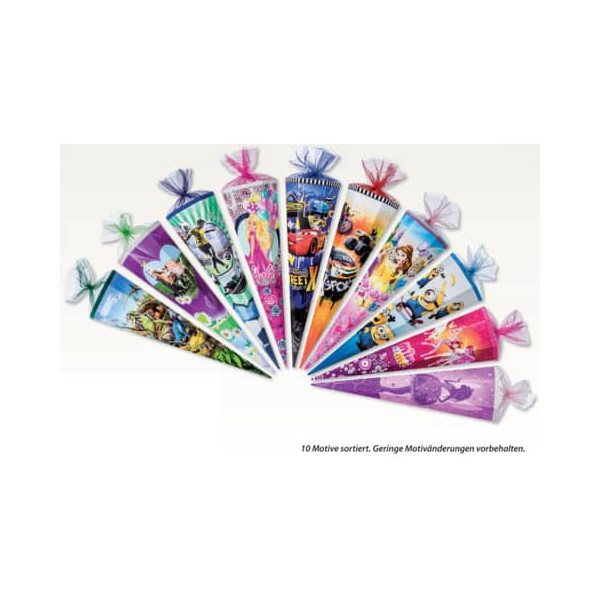 Die Schultüte hat einen stilvollen Tüllverschluss, der nicht nur funktional ist, sondern auch als schöner Blickfang dient. Die Motive sind sortiert, sodass jede Tüte einzigartig ist und die Vorfreude auf den Schulanfang steigert.
