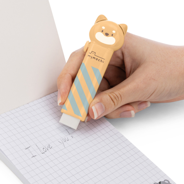 Das mymochi-Display enthält 24 Radiergummistifte mit den Designs Katze Angy und Hund Hiro. Ein einziehbarer Radiergummi wird durch eine bunt bedruckte Plastik-Stifthülle geschützt. Diese ist nicht nur stylisch, sondern verleiht auch jedem Schreibtisch einen Hauch Kawaii-Happiness.