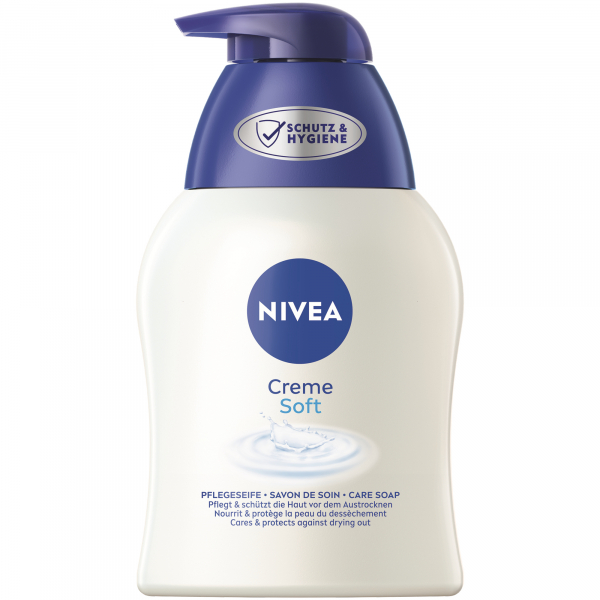 Viele Seifen trocknen die Hände beim Waschen aus. Nivea Creme Soft verwöhnt die Haut mit einem feinen, cremig-zarten Schaum, dessen Wirkstoffe pflegen und den Feuchtigkeitshaushalt aufrecht erhalten – fürglatte und geschmeidige Hände, als ergiebige Seife im praktischen Pumpspender.