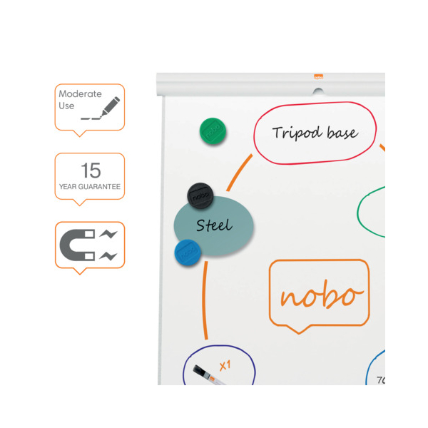 Magnetisch. Mit Teleskopbeinen. Stufenlos höhenverstellbar von 102 bis 186 cm. Hohe Löscheigenschaften. Resistent gegen Farbflecken, Stifteflecken, Kratzer und Dellen. Mit EU Ecolabel. Lieferung inklusive verstellbaren Haken für Blöcke, Stifteablage und einem Nobo Marker. Reinigung: trocken/feucht.