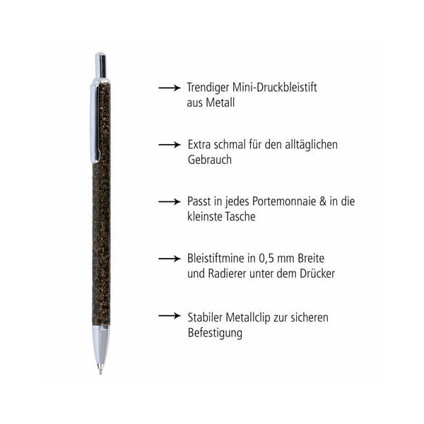 Hier sind die wichtigsten Eigenschaften des Druckbleistifts auf einen Blick:
