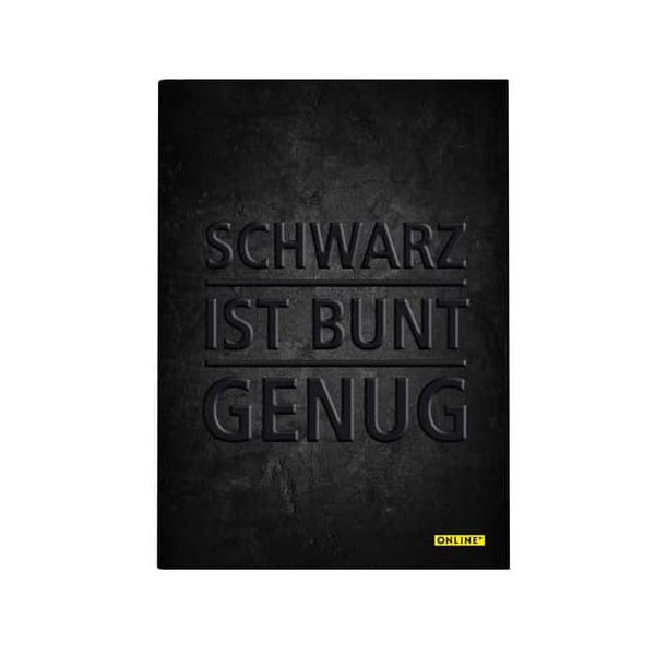 Online schwarz ist bunt genug 10126/6 Notizbuch in schwarz • Format: A5 • Lineatur: punktkariert • Grammatur der Seiten: 80 g/m² • Seitenanzahl: 192 Seiten (96 Blatt) • Hardcover