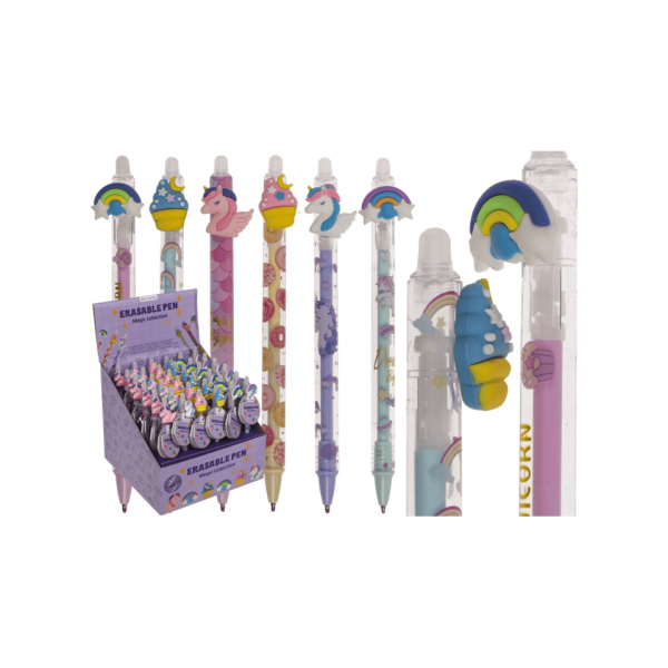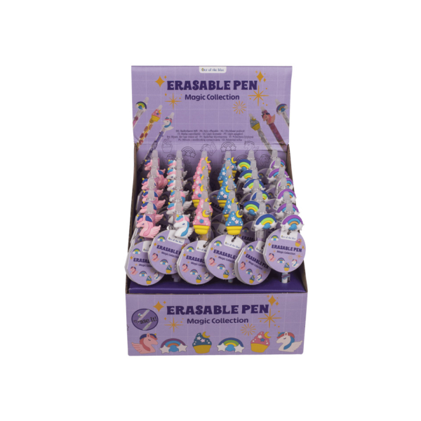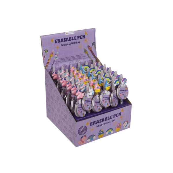 Farbenfrohe Gelschreiber aus der „Magical Collection“, mit radierbarer Tinte. In 6 verschiedenen Designs sortiert, ideal für Schule, Büro oder kreative Notizen. Die Stifte schreiben flüssig und lassen sich bei Bedarf einfach wegradieren. Lieferung erfolgt im Display.