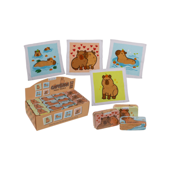 Kleines Handtuch aus weicher Baumwolle mit zauberhaftem Capybara-Motiv. Die Handtücher sind ca. 30 x 30 cm groß und in vier verschiedenen Designs sortiert. Ideal für Küche, Bad oder unterwegs
