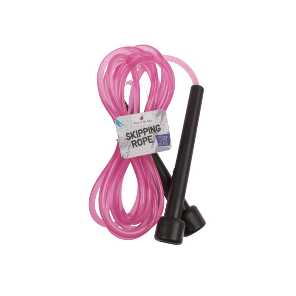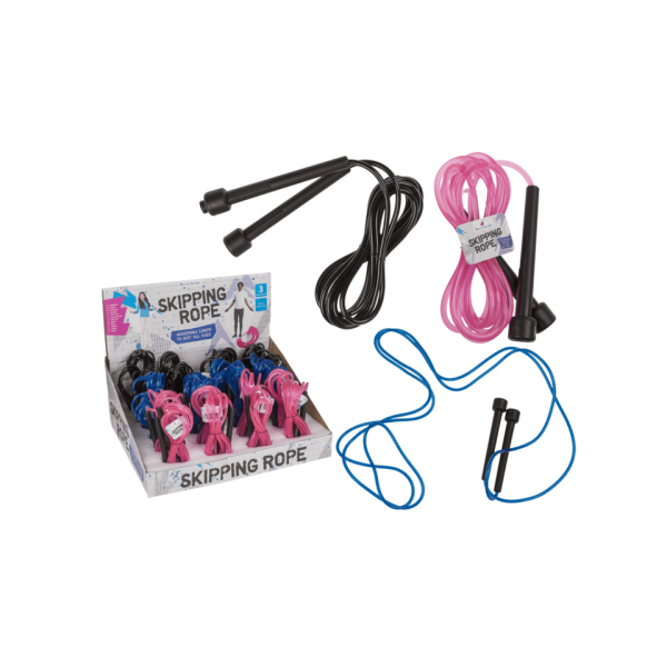Längenverstellbares Springseil mit einer maximalen Länge von 2,75 m, ideal für Kinder und Erwachsene. Sortiert in drei lebhaften Farben und praktisch im Display verpackt – perfekt für Spiel, Sport und Bewegung.