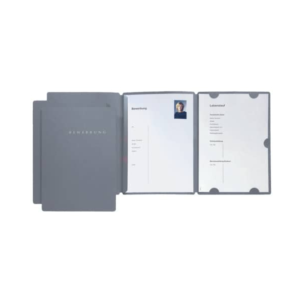 Die Pagna Bewerbungsmappe 22002 Select ist die ideale Lösung für Ihre Bewerbungsunterlagen im A4 Format. Die 3-teilige Mappe in edlem grau besteht aus hochwertigem Karton und verfügt über praktische Halbmondstanzungen sowie eine stabile Klemmschiene. Der silberne Schriftzug "Bewerbung" auf dem Vorderdeckel verleiht der Mappe eine professionelle Optik.