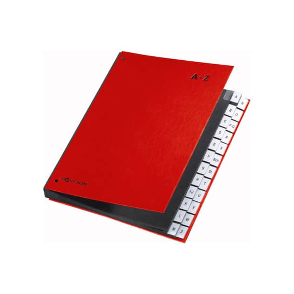 Der Pultordner hat die Abmessungen 26,5x34cm (BxH) und ist für das Format DIN A4 geeignet. Er ist in der Farbe Rot gehalten und verfügt über 24 Fächer, die mit A bis Z registriert sind. Dadurch können Sie Ihre Unterlagen einfach und schnell finden.