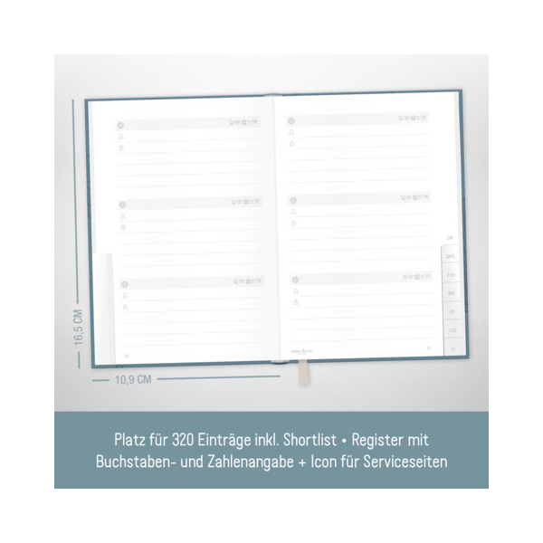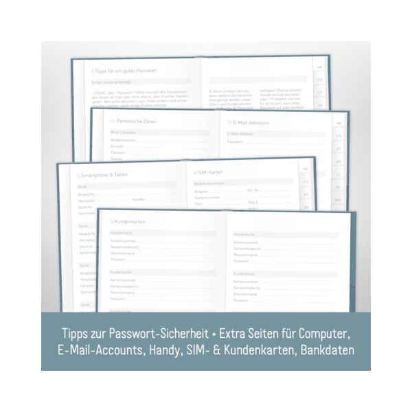 Register A-Z & Zahlen, Platz für über 320 Einträge, Shortlists, Seiten für E-Mails, Handy, Versicherungen, SIM- & Kundenkarten, Bankdaten, Links, Tipps zur Passwort-Sicherheit | |