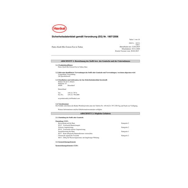 Reaktionsprodukt: Bisphenol-A-Epichlorhydrinharze mit durchschnittlichem Molekulargewicht ≤ 700 Bisphenol-F-Epichlorhydrinharze MG < 700 Enthält epoxidhaltige Verbindungen. Kann allergische Reaktionen hervorrufen.