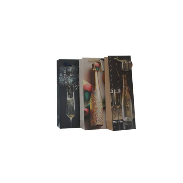 Entdecken Sie die stilvolle Geschenktasche 55032 von PBs, die perfekt geeignet ist, um Ihre Geschenke für besondere Anlässe zu verpacken. Diese attraktive Tasche ist ideal für Flaschen und bietet drei verschiedene Motive, die mit bunten Sektmotiven verziert sind.