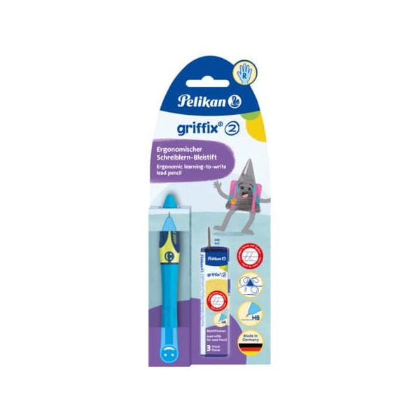 Entdecken Sie den Druckbleistift griffix R Schreiblernstift von Pelikan, der speziell für Rechtshänder entwickelt wurde. In der auffälligen Farbe Neon Fresh Blue und mit einer Mine von 2 mm Stärke ausgestattet, bietet dieser Stift eine perfekte Kombination aus Funktionalität und kindgerechtem Design.