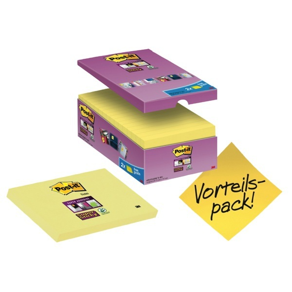 Ob im Büro oder Alltag: Von den extra zuverlässigen Post-it Super Sticky Notes Promotion sollten Sie immer genügend zur Hand haben. Die smarten Haftnotizen zeigen dank des speziellen Post-it Super Sticky Haftklebers superstarke, lange Haftkraft auch auf schwierigen Oberflächen, wie z.B. Monitore, Telefone, Türen oder Griffe von Einkaufswagen. Post-it Super Sticky Notes sind ohne Rückstände ablösbar und haften immer wieder. Format: 127 x 76 mm, Farbe: gelb. PEFC-zertifiziert. Vorteilspackung 16 Blöcke.
