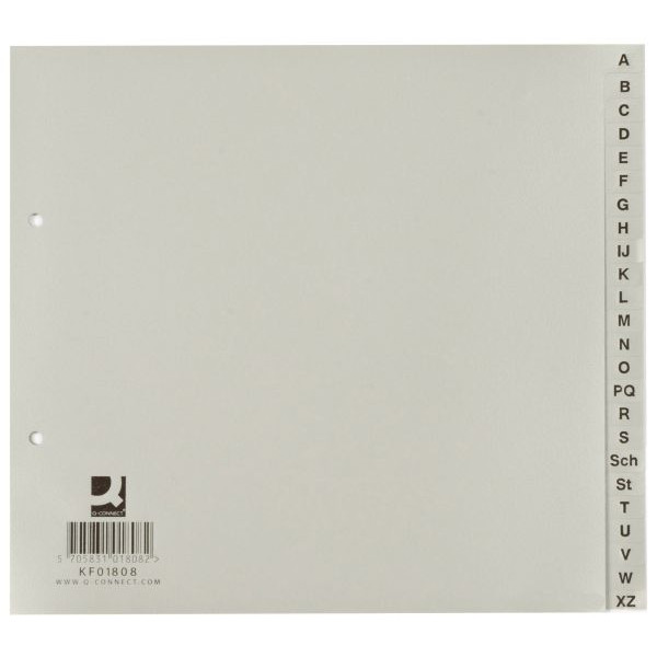 Entdecken Sie das hochwertige Kunststoffregister KF01808 von Q-connect, das Ihnen die perfekte Organisation für Ihre Unterlagen bietet. Mit einem klaren A-Z Aufdruck und grauen Taben ist dieses Register nicht nur funktional, sondern auch optisch ansprechend. Es ist besonders robust, da es aus Polypropylen mit einer Folienstärke von 120 µm gefertigt ist, was es langlebig macht.