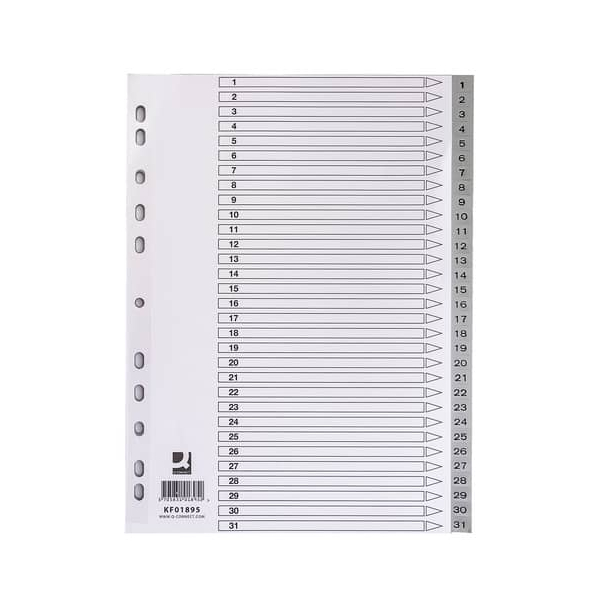 Q-connect KF01895 Zahlenregister in A4. • Tabenfarbe: graue Taben • Registerteilung: 1 bis 31 • Lochung: 11-fach-Lochung • Tabs nicht wechselbar