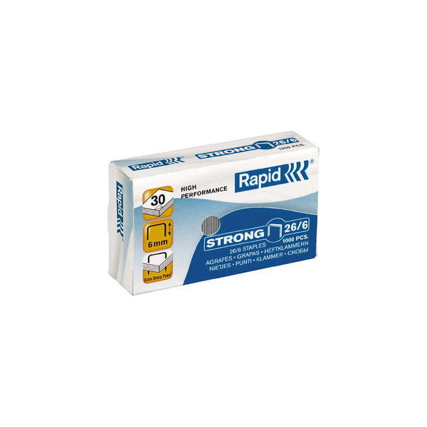 Rapid Tackerklammern strong 24861400 • Klammerntyp: 26/6 (= Standardgröße) • Schenkellänge: 6mm • Material: Stahldraht / Metall rostfrei • Farbe: verzinkt • Heftleistung: 30 Blatt max. (80g/m²) • geeignet für: passende Heftgeräte (s. Boden/Gehäuse)