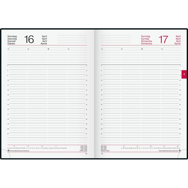 Mit einem großzügigen Format von 29,1 x 21 cm (A4) bietet der Kalender ausreichend Platz für Ihre täglichen Notizen und Termine. Die durchdachte Seitenteilung von 1 Tag / 1 Seite ermöglicht es Ihnen, Ihre Planung übersichtlich und strukturiert zu gestalten.
