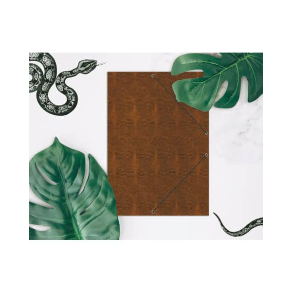 Hochwertiger Karton mit griffiger Oberflächenstruktur die der Tierwelt nachempfunden wurde. Die Mappe verfügt über drei Einschlagklappen am hinteren Deckel, der Gummizug sichert und schützt den Inhalt zusätzlich.