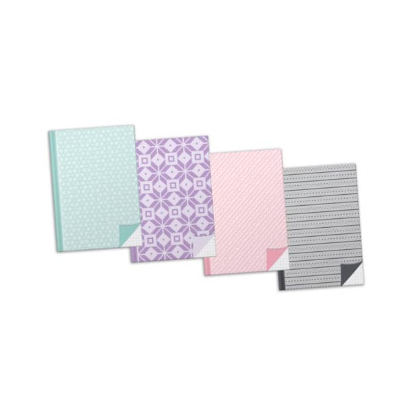 4 Kladden/Notizbücher mit unterschiedlichen Motiven: "Mint" Art.Nr. 46801, "Berry" Art.Nr. 46802, "Rosé" Art.Nr. 46803, "Grey" Art.Nr. 46804. DIN A5.