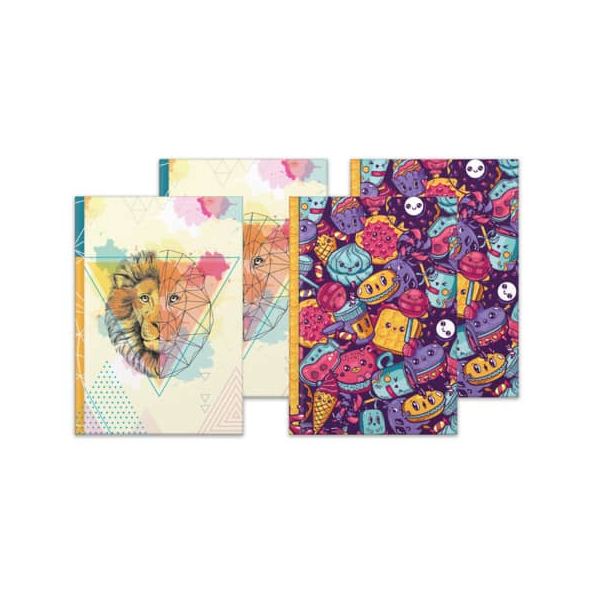 4 Kladden/Notizbücher mit unterschiedlichen Motiven: 1x „Löwe“ Art.Nr. 46809, 1x „Süßigkeiten“ Art.Nr. 46810, 1x „Neon“ Art.Nr. 46822, 1x „Delfine“ Art.Nr. 46823 DIN A4.