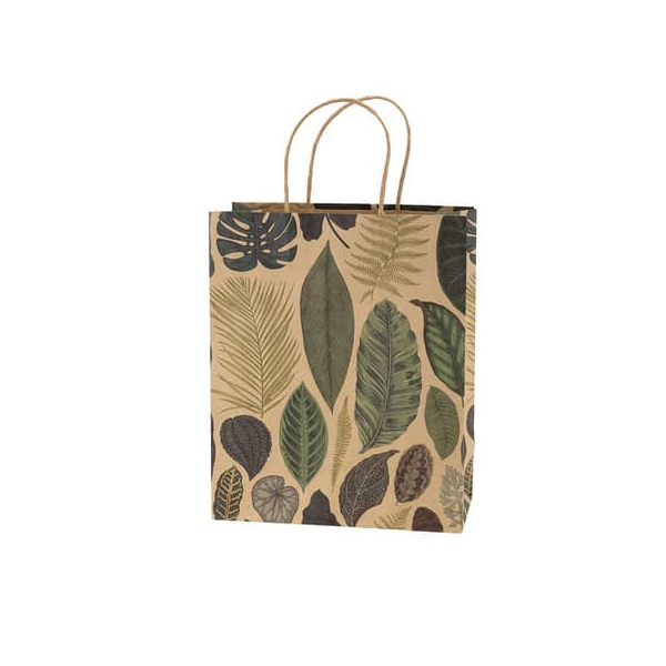 Die Tasche ist mit einem ansprechenden Blätter-Motiv versehen, das eine freundliche und natürliche Ausstrahlung bietet. Die Kombination aus beige, grün und grautönen verleiht der Tasche einen modernen Look, der zu vielen Geschenken passt.
