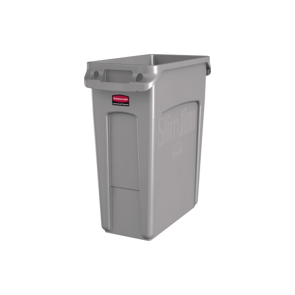 Der Slim Jim®-Behälter ist ein strapazierfähiger Abfallbehälter aus Polyethylen. Geformte Griffe erleichtern das Anheben und Tragen. Lüftungskanäle reduzieren die Zugkraft beim Entfernen des Liners. Er ist kompatibel mit allen Rubbermaid Deckeln und hat ein Fassungsvermögen von 60 Litern. Farbe: grau.
