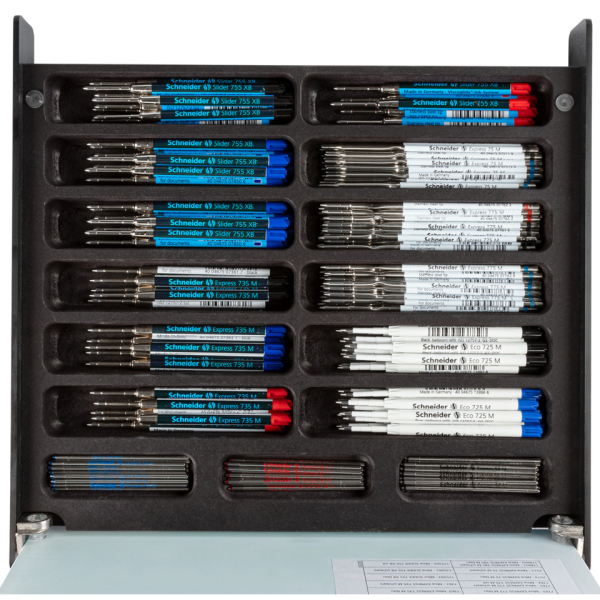 Der praktische Theken-Zahlteller mit bruchstabiler Echtglasplatte ist mit den gängigsten Minenformaten und Schreibfarben gefüllt. Alle hochwertigen