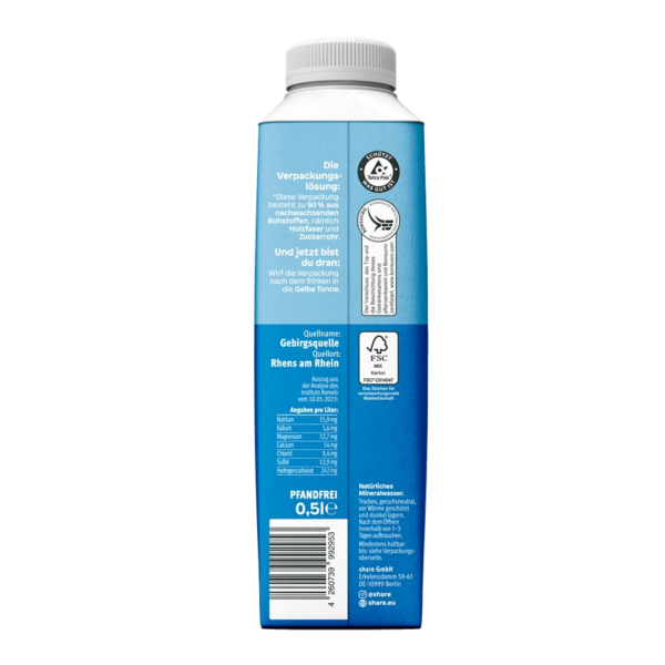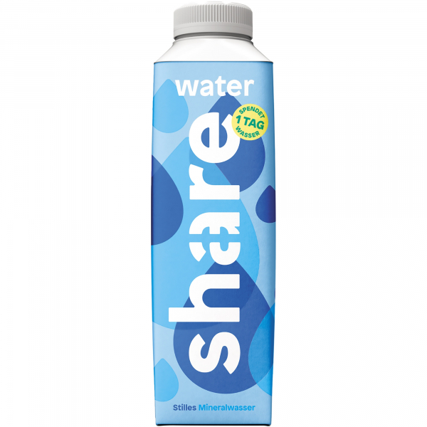 Bestseller in neuem Gewand: Das Wasser von share GmbH gibt es jetzt auch pfandfrei! Die neue Verpackung besteht bereits zu 88% aus nachwachsenden Rohstoffen - einem pflanzenbasierten Kunststoff und Holzfasern. Das Wasser darin ist natriumarm und entstammt der Allgäu Quelle. Wie jedes share-Getränk spendet auch das Wasser im TetraPak einen Tag Trinkwasser.