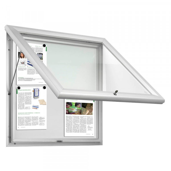 Präsentieren Sie Ihre Nachrichten oder Notizen sicher mit unserem abschließbaren Schaukasten Schaukasten für Außen mit beschreibbarer Metallrückwand. Der Schaukasten lässt sich unten öffnen und mit einem Schlüssel sicher verschließen, was einen einfachen Zugang und zusätzliche Sicherheit gewährleistet. Ab einer Größe von 12 x A4 sind Gasdruckfedern enthalten, die die Fronttür halten und für den Komfort des Benutzers sorgen. Notizen oder Nachrichten können mit Hilfe von Magneten leicht in der Vitrine angebracht werden. Der Schaukasten ist B1-zertifiziert, was ihn zu einem sicheren und idealen Schaukasten für den Gebrauch macht.