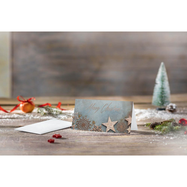 Mit einmaligem Motiv und ruck-zuck bedruckt: Weihnachtskarten Glamorous Christmas (Motiv: Weihnachtssterne in blau, kupfer) im Format DIN lang (Weißkarton, 210 g/m², 10 Karten). Hochwertig veredelt: Kupferprägung für eine Optik mit dem besonderen Etwas. Inkl. 10 passender, gummierter Umschläge. Überraschen Sie Geschäftspartner, Mitarbeiter, Kollegen oder auch Freunde und Familie mit exklusiven Grüßen zur Weihnachtszeit. Individuell und unkompliziert bedruckbar - für Ihre persönliche und einzigartige Weihnachtspost im Handumdrehen. Keine Abhängigkeit von Druckereien, geringe Auflagen ganz nach Bedarf - und das in Premiumqualität.