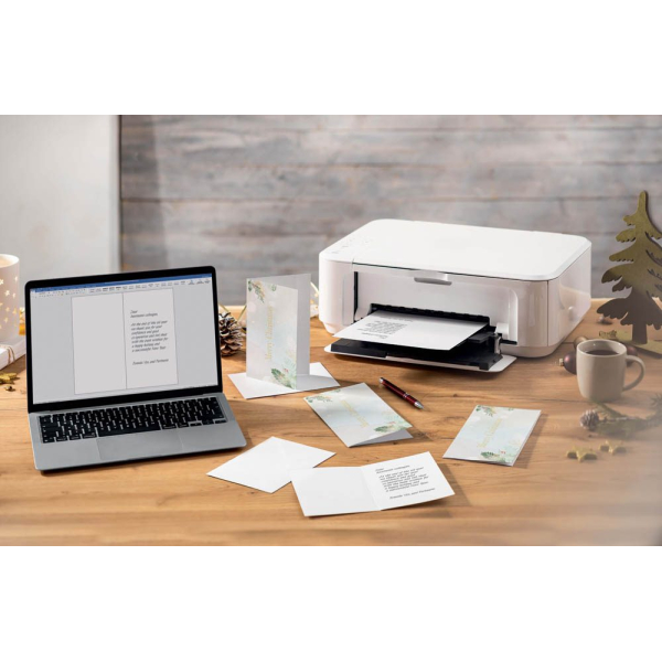 Mit einmaligem Motiv und ruck-zuck bedruckt: Weihnachtskarten "Christmas Forest Watercolor" (Motiv: Tannenzweige Aquarell in blau, grün, gold) im Format DIN lang (Weißkarton, 250 g/m², 25 Karten). Inkl. 25 passender, gummierter Umschläge. Überraschen Sie Geschäftspartner, Mitarbeiter, Kollegen oder auch Freunde und Familie mit exklusiven Grüßen zur Weihnachtszeit. Individuell und unkompliziert bedruckbar - für Ihre persönliche und einzigartige Weihnachtspost im Handumdrehen. Keine Abhängigkeit von Druckereien, geringe Auflagen ganz nach Bedarf - und das in Premiumqualität.