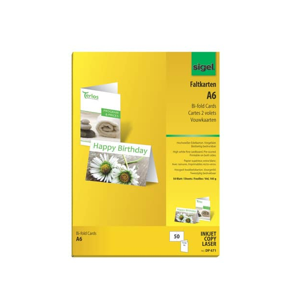 Lassen Sie Ihrer Kreativität freien Lauf mit dem Motivpapier DP 671 von Sigel: 50 Stück hochweiße Faltkarten im Format A6 (Edelkarton für Ink/Laser/Copy, 185 g/m²). Die hochweißen Blankokarten ohne Vordruck sind individuell gestaltbar und ermöglichen es Ihnen, persönliche Akzente zu setzen.