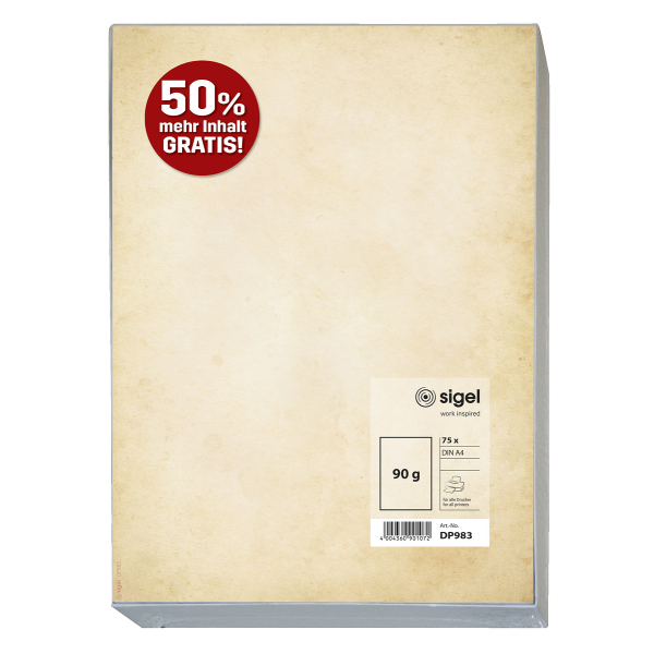 Mit einmaligem Design und ruck-zuck bedruckt: Motiv-Papier "Vintage" (Motiv: Vintage in beige) im Format A4 (Feinpapier, 90 g/m², 75 Blatt). Das SIGEL Design-Papier in hochwertiger Markenqualität ist für viele Anlässe und unzählige Zwecke einsetzbar: als Einladung, Speise- oder Menükarte, für jede Art von Glückwünschen oder einfach nur als Information oder Angebot. Das Briefpapier lässt sich ganz einfach mit dem PC gestalten und bedrucken oder per Hand beschriften. Keine Abhängigkeit von Druckereien, geringe Auflagen ganz nach Bedarf. Viele weitere besondere Motive finden Sie exklusiv im SIGEL Sortiment.