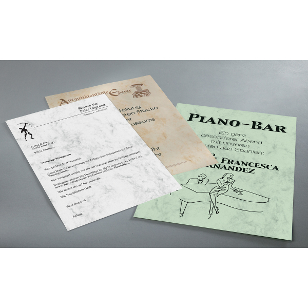Sigel Briefpapier T1080, grau, marmoriert, A4, 90g | Sigel Briefpapier DP128, braun, Wood, A4, 90g | Sigel Briefpapier DP243, Papyra, A4, 90g | Sigel Briefpapier DP639, blau, Granitstruktur, A4, 90g | Sigel Briefpapier DP129, beige/orange, Sonnenblumen, A4, 90g | Sigel Briefpapier DP297, Champagner-Flasche, A4, 90g | Sigel Briefpapier DP 344, blau, Farbverlauf blau, A4, 90g | Sigel Briefpapier DP565, Wolken, A4, 90g | Sigel Briefpapier DP625, gold/beige, Aquarell, A4, 90g | Sigel Briefpapier DP607, grau, Pergament, A4, 90g |