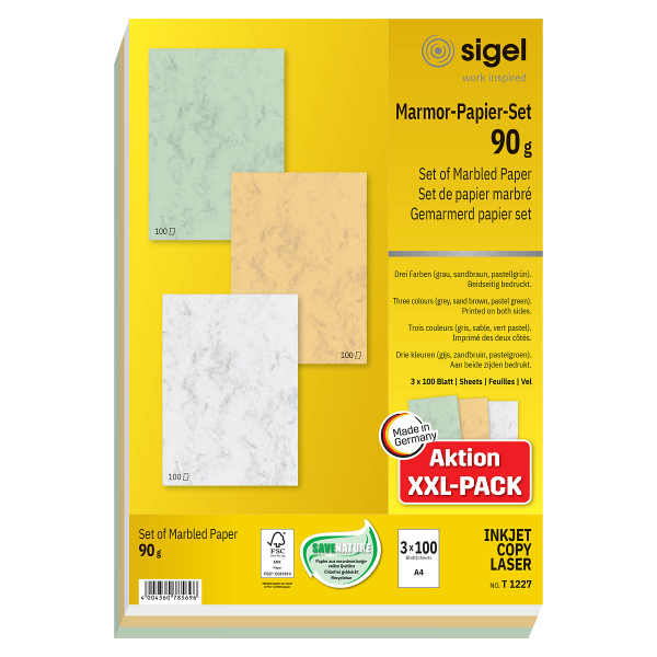 Mit schönem Struktur-Motiv und ruck-zuck bedruckt: Marmor-Papier-Set, sandbraun, pastellgrün, grau, Motiv/Druck beidseitig, im Format A4 (Feinpapier, 90 g/m², 300 Blatt). Das SIGEL Design-Papier in hochwertiger Markenqualität ist für viele Anlässe und unzählige Zwecke einsetzbar: als Einladung, Speise- oder Menükarte, für jede Art von Glückwünschen oder einfach nur als Information oder Angebot. Das Briefpapier lässt sich ganz einfach mit dem PC gestalten und bedrucken oder per Hand beschriften. Keine Abhängigkeit von Druckereien, geringe Auflagen ganz nach Bedarf. Viele weitere besondere Motive finden Sie exklusiv im SIGEL Sortiment.