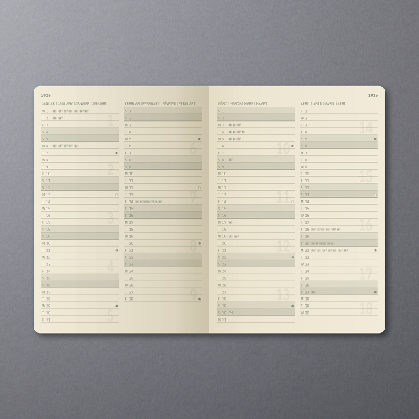 | 1 Woche / 2 Seiten 1 Woche / 2 Seiten in Buchkalender anzeigen | |
