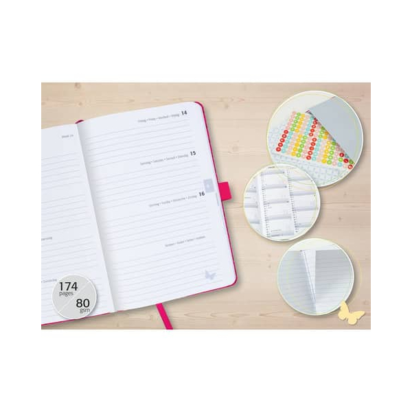 Die robuste Hardcover-Oberfläche schützt Ihre Eintragungen und garantiert Langlebigkeit. Mit 80 g/m² hochwertigem, FSC-zertifiziertem Papier bietet der Kalender eine angenehme Schreibeigenschaft und Umweltfreundlichkeit zugleich. Zudem ist er mit nützlichen Extras wie einem Gummibandverschluss, einer Stiftschlaufe und einer Einstecktasche ausgestattet, die Ihnen helfen, alle wichtigen Informationen sicher zu verstauen.