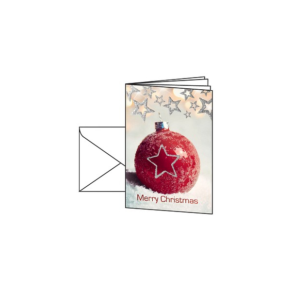 Mit einmaligem Motiv und ruck-zuck bedruckt: Weihnachts-Karten "Christmas Bauble" (Motiv: Weihnachtskugel in rot, silber) im Format A6 (Edelkarton, 220 g/m², 10 Karten). Hochwertig veredelt: Blindprägung, Folienprägung, Lackprägung für eine Optik mit dem besonderen Etwas. Inkl. 10 passender, gummierter Umschläge. Überraschen Sie Geschäftspartner, Mitarbeiter, Kollegen oder auch Freunde und Familie mit exklusiven Grüßen zur Weihnachtszeit. Individuell und unkompliziert bedruckbar - für Ihre persönliche und einzigartige Weihnachtspost im Handumdrehen. Keine Abhängigkeit von Druckereien, geringe Auflagen ganz nach Bedarf - und das in Premiumqualität.