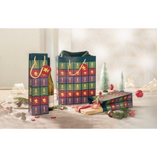 Entdecken Sie die hochwertige Geschenktasche GT046 im stilvollen Design Cut-out style von SIGEL. Diese festliche Tasche bringt weihnachtliche Stimmung in Ihr Präsent und eignet sich perfekt für jeden Anlass während der festlichen Jahreszeit. Sie ist mit durchdachten Motiven, darunter Baum, Kerze und Stern, versehen, die Ihre Geschenke noch ansprechender machen.