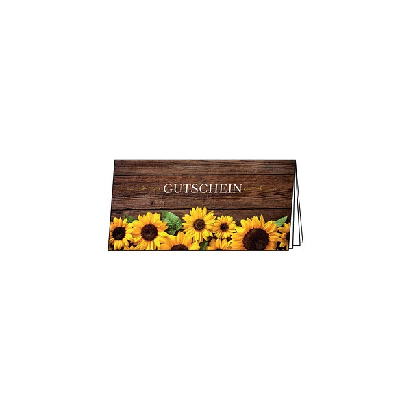 Mit einmaligem Motiv und ruck-zuck bedruckt: die Gutschein-Karten "Sunfield" (Motiv: Sonnenblumen in gelb und braun) kommen im praktischen Format DIN Lang. Der Glanzkarton hat eine Grammatur von 220 g/m² und die Packung enthält 10 Karten sowie 10 passende, gummierte Umschläge. Diese hochwertigen Karten sind ein ideales Geschenk und kommen in der Gastronomie oder vielen weiteren Branchen mit Geldwert immer gut an. Der Gutschein lässt sich einfach mit dem PC gestalten und im offenen Format bedrucken oder auch per Hand beschriften. Zudem sind die Karten vorgerillt, was ein einfaches Falten ermöglicht.