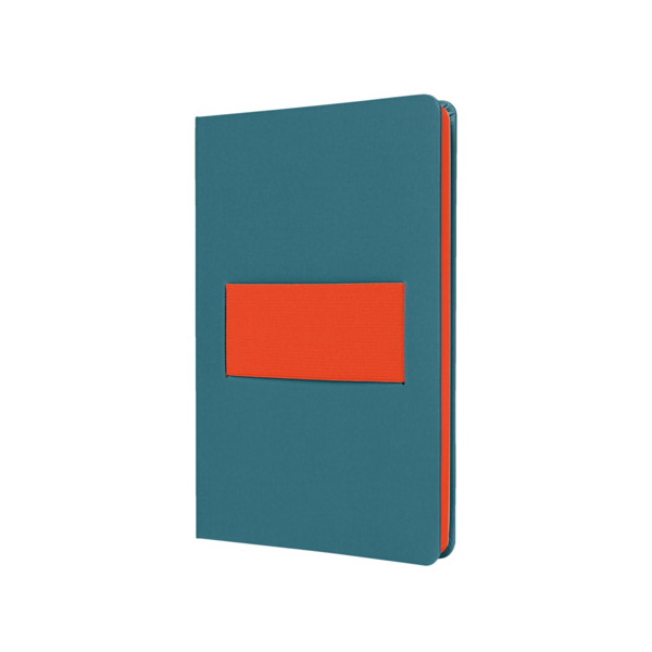 Das Notizbuch verfügt über ein breites Gummiband, das zum sicheren Verstauen von Kleinutensilien wie Stiften, Handy oder Taschenrechner dient. Der farbige Buchschnitt und die Vorsatzseiten harmonieren perfekt mit der Farbkombination des Covers und setzen zusätzliche Akzente.