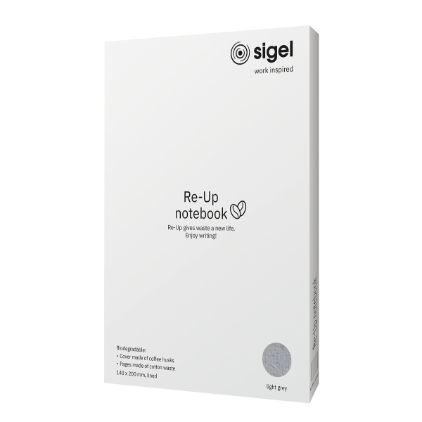 Notizbuch mit Softcover in hellgrau, Format ca. A5 (14 x 20 cm), liniert, mit 100 Seiten. Bei diesem Notizbuch der Serie Re-Up von SIGEL ist der Name Programm: Re-Up setzt sich zusammen aus Recycling und Upcycling. Das Notizbuch besteht aus Abfällen der Kaffeeröstung und Baumwollproduktion (Cover aus Kaffeebohnenschalen, Seiten aus Baumwollresten), das heißt für dieses Buch wurde kein Baum gefällt. Es kommt in plastikfreier Verpackung und ist komplett kompostierbar. Jedes Buch ist ein reines Naturprodukt und ein absolutes Unikat. Die Seiten sind ideal beschreibbar mit Bleistift oder Kugelschreiber. Mit jedem Buch sparen Sie 8 Liter Wasser, außerdem ist es komplett ohne Chemikalien hergestellt.