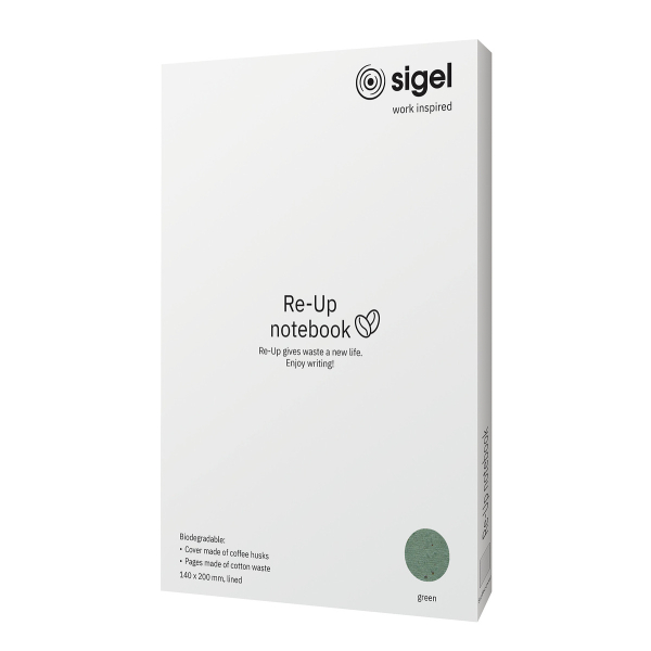 Notizbuch mit Softcover in grün, Format ca. A5 (14 x 20 cm), liniert, mit 100 Seiten. Bei diesem Notizbuch der Serie Re-Up von SIGEL ist der Name Programm: Re-Up setzt sich zusammen aus Recycling und Upcycling. Das Notizbuch besteht aus Abfällen der Kaffeeröstung und Baumwollproduktion (Cover aus Kaffeebohnenschalen, Seiten aus Baumwollresten), das heißt für dieses Buch wurde kein Baum gefällt. Es kommt in plastikfreier Verpackung und ist komplett kompostierbar. Jedes Buch ist ein reines Naturprodukt und ein absolutes Unikat. Die Seiten sind ideal beschreibbar mit Bleistift oder Kugelschreiber. Mit jedem Buch sparen Sie 8 Liter Wasser, außerdem ist es komplett ohne Chemikalien hergestellt.