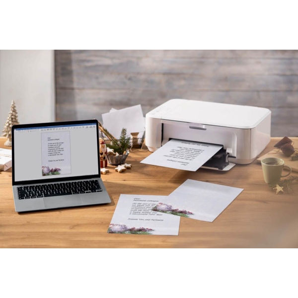 Überraschen Sie Ihre Geschäftspartner, Mitarbeiter, Kollegen oder auch Freunde und Familie mit individuellen und stilvollen Grüßen zur Weihnachtszeit. Dieses Weihnachtsbriefpapier ist unkompliziert bedruckbar, sodass Sie im Handumdrehen Ihre persönliche und einzigartige Weihnachtspost gestalten können, ganz ohne die Abhängigkeit von Druckereien. Genießen Sie die Freiheit, kleine Auflagen ganz nach Bedarf zu erstellen, und das in herausragender Premiumqualität.