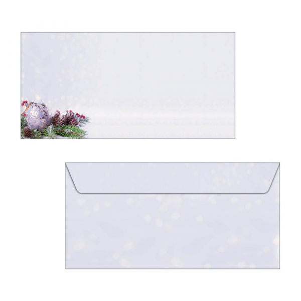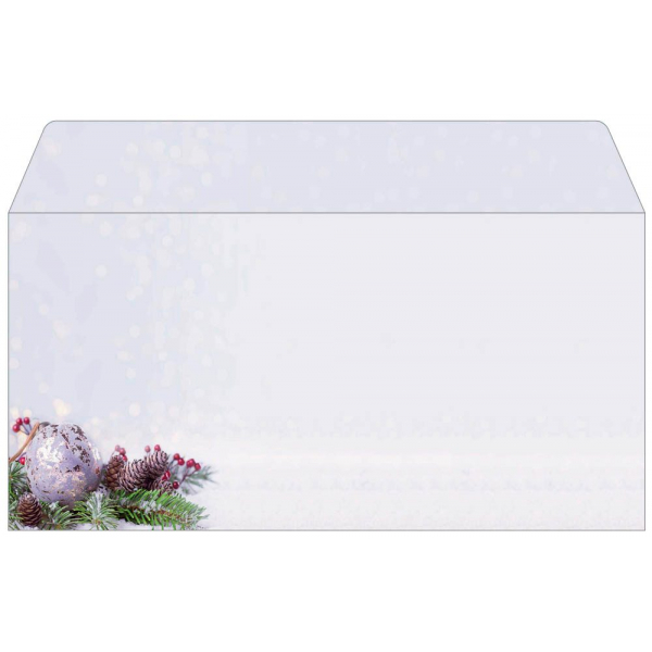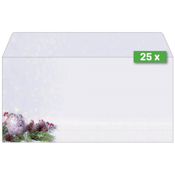Stilvolle Weihnachtsumschläge "Charmful Christmas" (Motiv: Weihnachtskugel auf Tannenzweig in blau, grün, braun) im Format DIN lang, 25 Umschläge mit gummierter Klappe. Überraschen Sie Geschäftspartner, Mitarbeiter, Kollegen oder auch Freunde und Familie mit exklusiven Grüßen zur Weihnachtszeit. Individuell und unkompliziert bedruckbar - für Ihre persönliche und einzigartige Weihnachtspost im Handumdrehen. Keine Abhängigkeit von Druckereien, geringe Auflagen ganz nach Bedarf - und das in Premiumqualität.