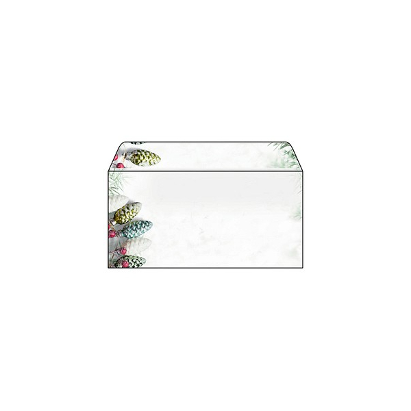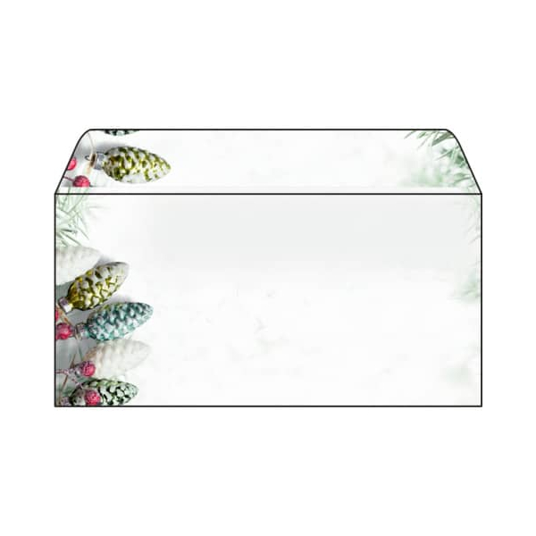 Stilvolle Weihnachtsumschläge "Christmas Garland" (Motiv: Tannenzapfen in grün, weiß) im Format DIN lang, 50 Stück mit gummierter Klappe. Überraschen Sie Geschäftspartner, Mitarbeiter, Kollegen oder auch Freunde und Familie mit exklusiven Grüßen zur Weihnachtszeit. Individuell und unkompliziert bedruckbar - für Ihre persönliche und einzigartige Weihnachtspost im Handumdrehen. Keine Abhängigkeit von Druckereien, geringe Auflagen ganz nach Bedarf - und das in Premiumqualität.
