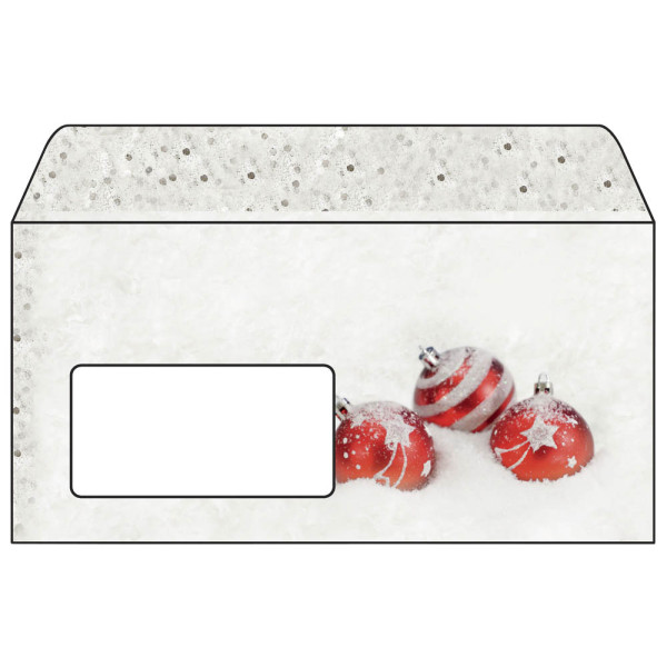 Stilvolle Weihnachtsumschläge "Winter Flair" (Motiv: Weihnachtskugeln in rot) im Format DIN lang, 50 Stück mit gummierter Klappe. Überraschen Sie Geschäftspartner, Mitarbeiter, Kollegen oder auch Freunde und Familie mit exklusiven Grüßen zur Weihnachtszeit. Individuell und unkompliziert bedruckbar - für Ihre persönliche und einzigartige Weihnachtspost im Handumdrehen. Keine Abhängigkeit von Druckereien, geringe Auflagen ganz nach Bedarf - und das in Premiumqualität.