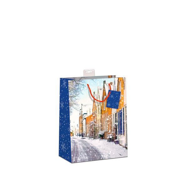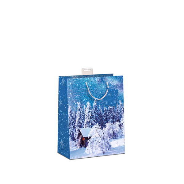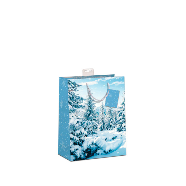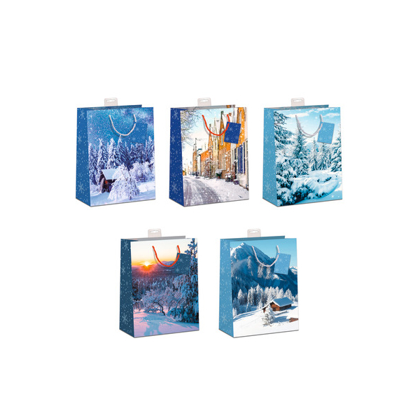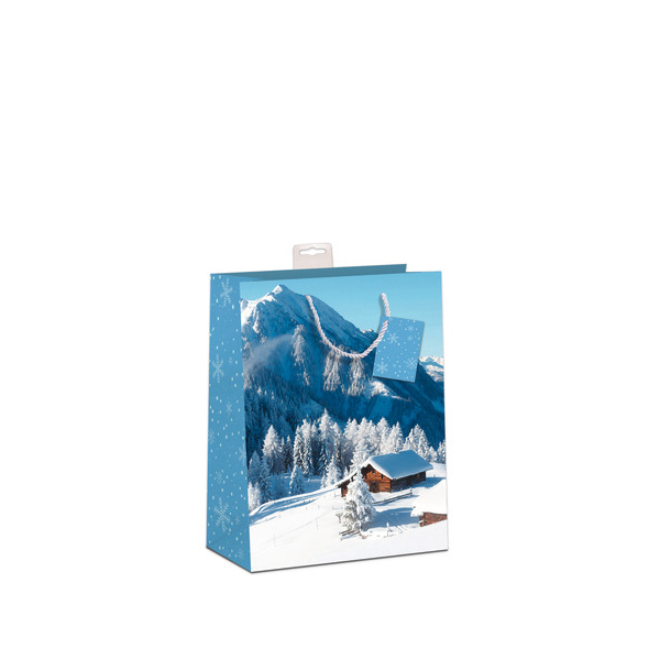 Die Geschenktasche ist in fünf winterlichen Landschaftsmotiven erhältlich und verleiht Ihren Geschenken eine stimmungsvolle Note. Ausgestattet mit einer farbigen Kordel, einer Namenskarte und einer praktischen Eurolochvorrichtung, ist sie sowohl funktional als auch festlich.