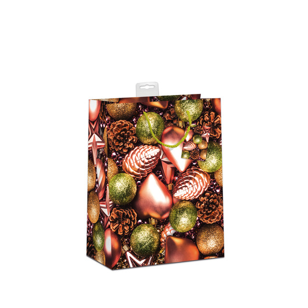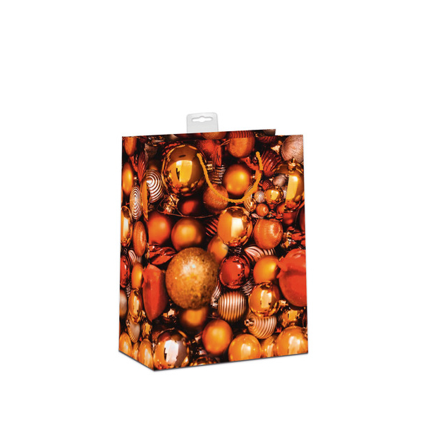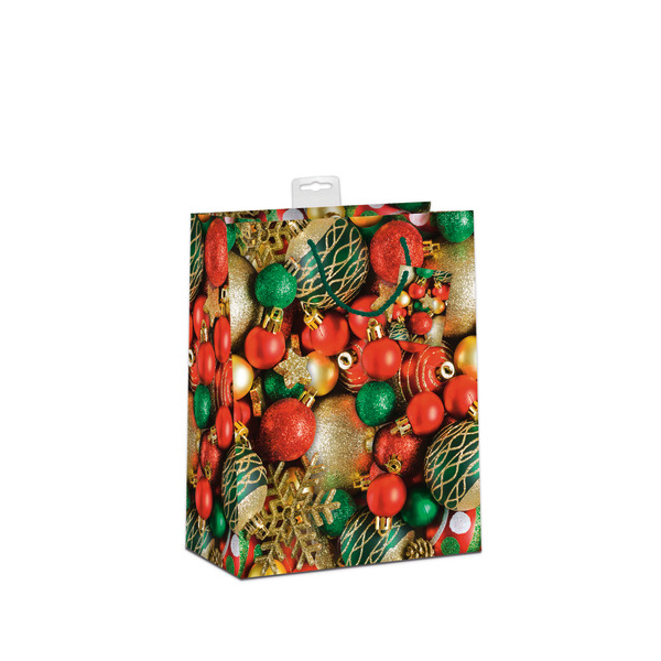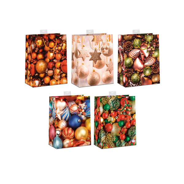 Diese festliche Geschenktasche ist nicht nur optisch ansprechend, sondern auch funktional. Sie ist mit Dispersionslack und einer edlen Folienkaschierung veredelt, was ihr einen besonderen Glanz verleiht. Zeigen Sie Ihre Kreativität mit den fünf festlichen Kugel-Motiven, die in sortierter Auswahl aufgedruckt sind.
