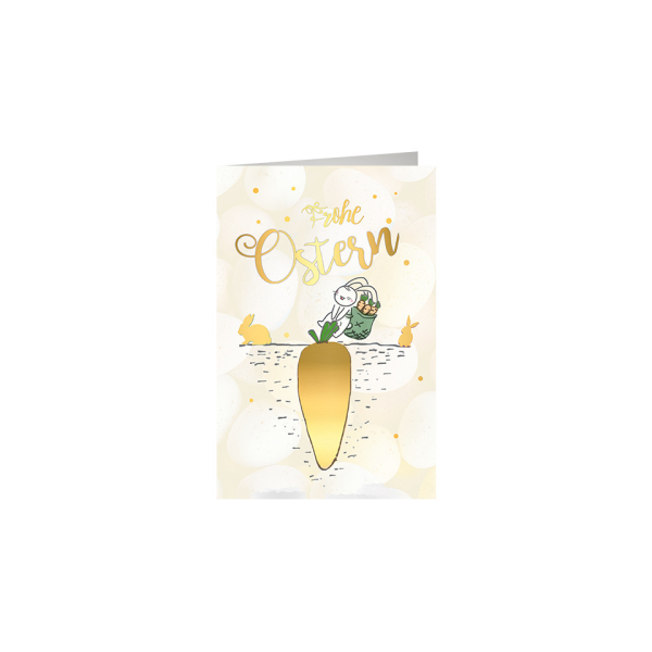 Die Osterkarte ist im Hochformat 11,5 x 17 cm gestaltet und besteht aus Naturkarton. Sie ist mit Goldfolie veredelt und kommt ohne Applikationen. Farbig passende Kuverts sind enthalten. Das Set umfasst 5 Karten mit Umschlägen.